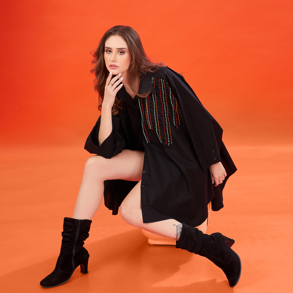 Black Poplin Kaftan Shirt with Handcrafted Bead Embellishments – Oversized Fit