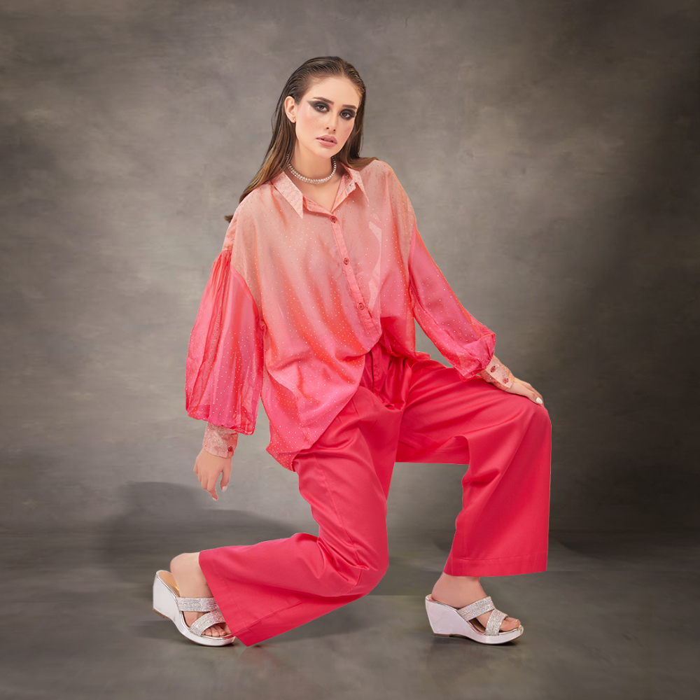 Peach & Pink Shaded Oversized Flowy Shirt with Coordinated Korean Fit Pants
